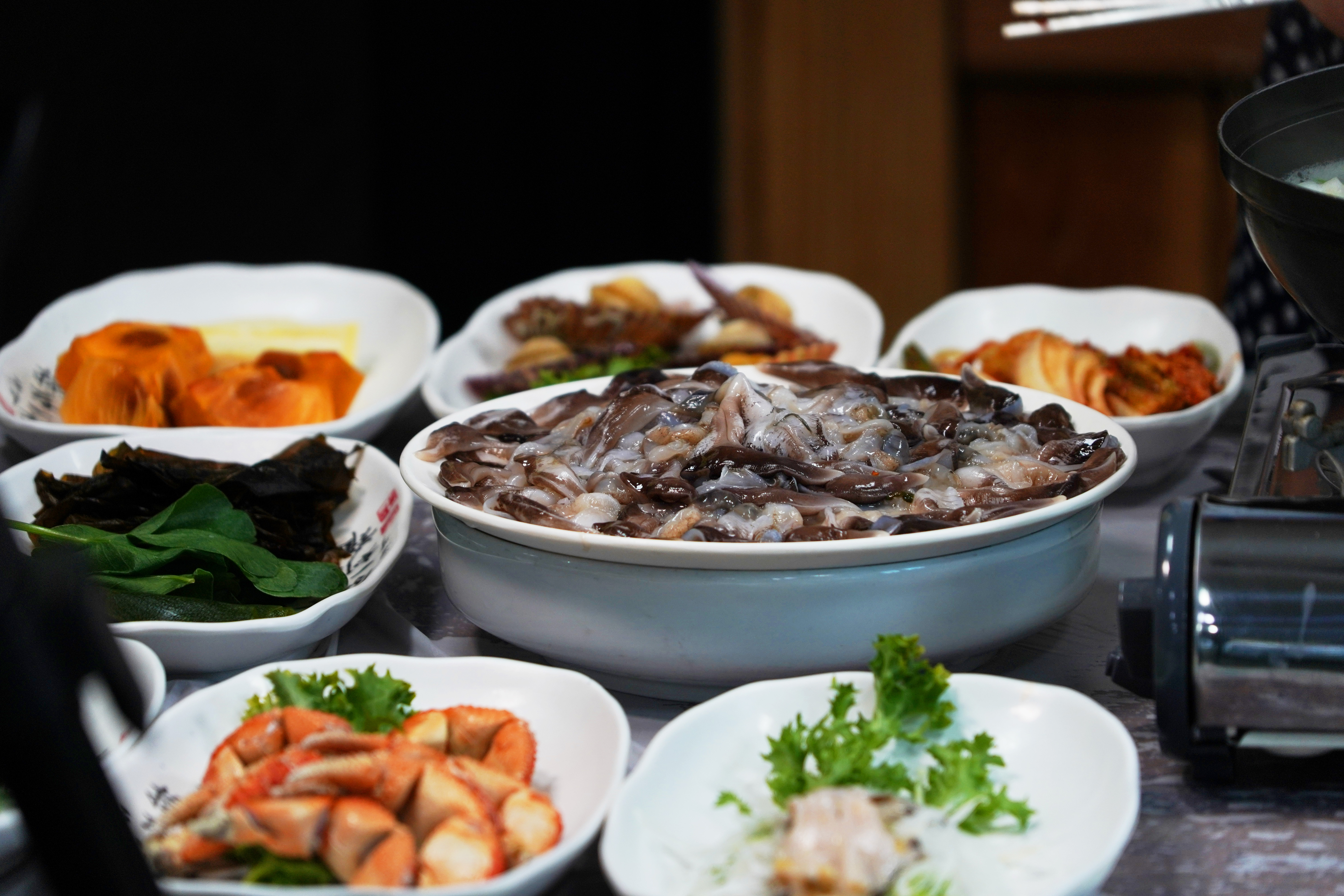 ② 해물정식 – 낙지, 새우, 전복, 가리비, 홍합, 백합, 꽃게가 냄비에 흘러넘칠 정도로 수북이 쌓여 있는 해물탕 등 보기만 해도 배가 부를 만큼 푸짐한 한상이 차려진다.